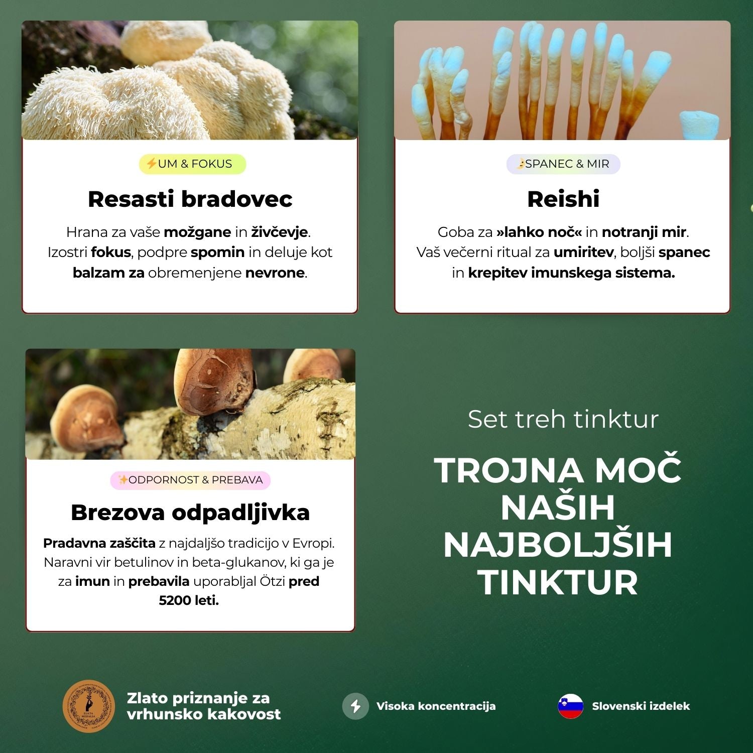 Set tinktur iz resastega bradovca, reishija in brezove odpadljivke.